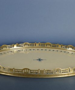 Dit royale ovalen dienblad is gemaakt van porselein en uniek door zijn formaat. Het is gedecoreerd met een grijs-blauw fantasiepatroon. Het grote stuk ovaal porselein is gevat in een metalen opstaande rand met een strak Berlage motief. Oorspronkelijk had het dienblad aan weerszijde oren en stond op vier bolvormige pootjes. Aan de onderzijde is een blauw stempel te zien: Deo 2501. Vermoedelijk gemaakt in de jaren rond 1920-1930.