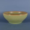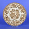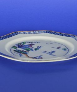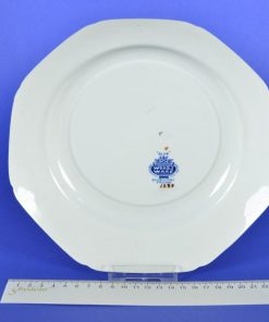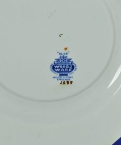Een prachtig dinerbord in Art Deco stijl. De lijn ‘Alva’, is ontworpen door Woodsware Engeland in de jaren 1920-1925. Het thema is gestileerde huizen in een landschap. De ondergrond is wit. De kleuren zijn met de hand ingeschilderd. De achtkantige vorm is afgewerkt met een okerkleurige bies langs de rand met fantasiemotief. Aan de achterzijde staat behalve het porseleinstempel ook een met de hand opgebracht nummer, 2085, een cijfer 1, en een blindmerk 627.