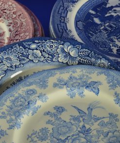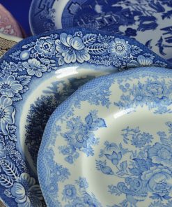 Set van drie prachtige donkerblauw met witte dinerborden uit Engeland in de serie Churchill Willow. Het decor toont een Chinees landschap met pagodes bootjes en vogels, de rand heeft een meander fantasiepatroon. Het bord is druk bewerkt en toch rustig en geordend. Vind de overige borden onder het kopje andere suggesties hieronder.