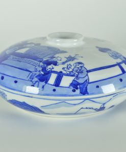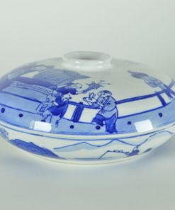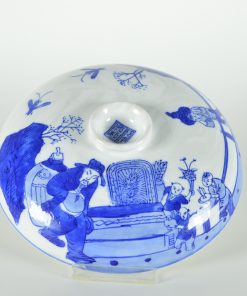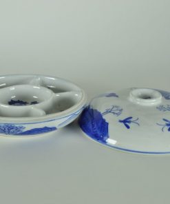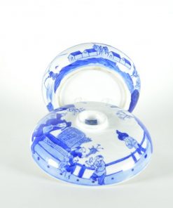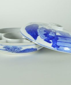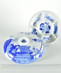 Dit bijzonder, dikwandig, zeer oude antieke dinerbord heeft een deksel en vijf vakken zodat de porties voedsel gescheiden blijven, hun eigen smaak behouden en met de deksel erop langer lekker warm blijven. De witte basis met blauwe decoratie is handgeschilderd in een prachtig diepblauw met een voorstelling van mensen, bloemen en insecten in een landschap. Geproduceerd in China.