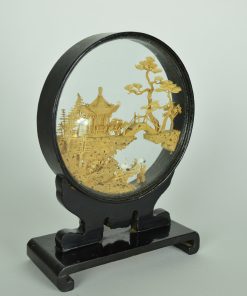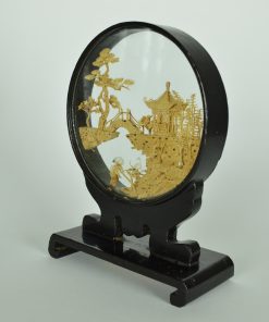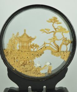 Prachtig handgemaakt diorama, of kijkkast, met een voorstelling van een ongelofelijk gedetailleerd uit kurk gesneden landschap met bomen, een pagode, een brug en twee kraanvogels. De delicate voorstelling is zeer kwetsbaar. Gemaakt in China.