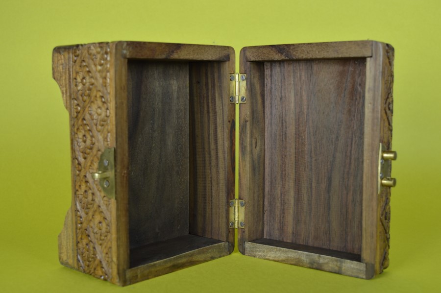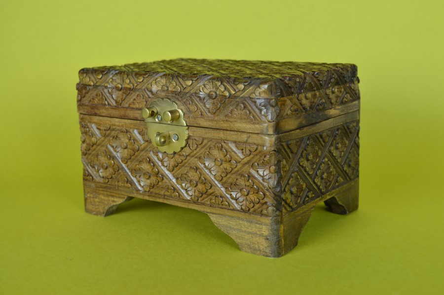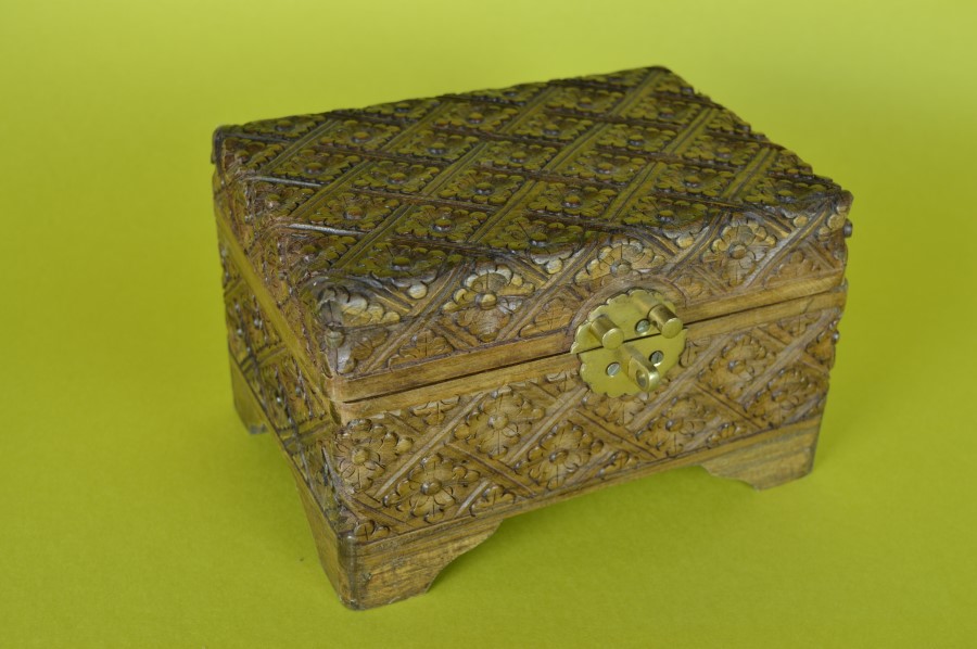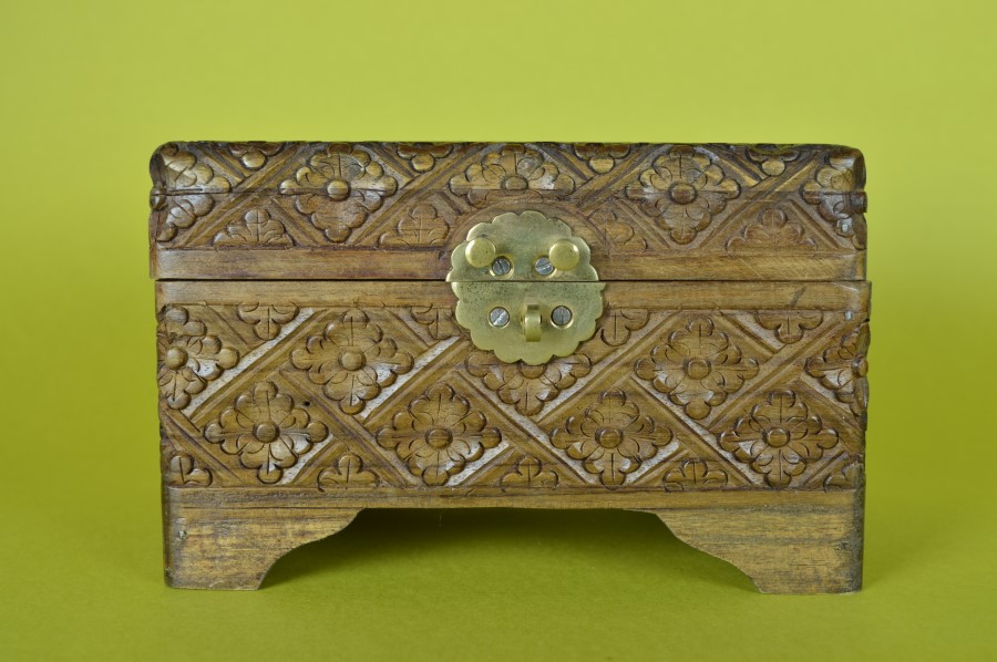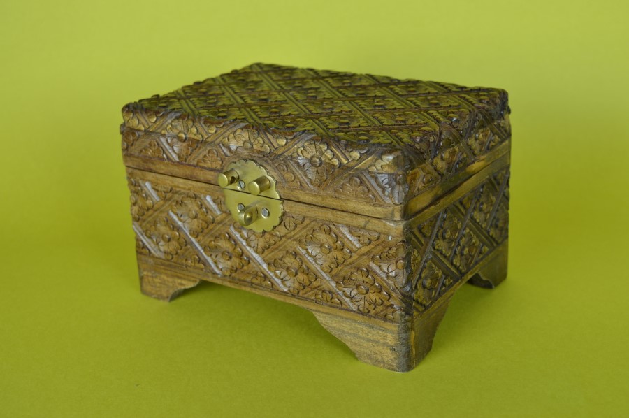 Decoratief, sfeervol en robuust kistje op vier voetjes met een stevig slot van koper. Het hout is rondom strak uitgestoken in een gevlochten ruitpatroon met bloemen. Vermoedelijk uit Azië. Het hangslotje ontbreekt. Sluit en scharniert uitstekend.