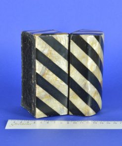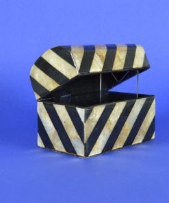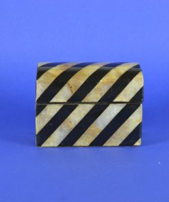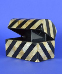 VERKOCHT Mooi, sfeervol gestreept doosje met houten basis bewerkt met glanzend parelmoer. De fluwelen binnen-, en onderkant zijn zwart. De tekst Tesoro’s Manila staat in het deksel.
