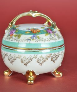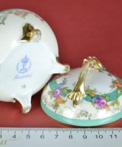 Dit snoezige doosje is gedecoreerd met roze roosjes en verguld gouden en groene biezen. Het staat op vier vergulde pootjes. Aan de onderzijde gemerkt; Oscar Schlegelmilch, Langewiesen, Thüringen, Duitsland.