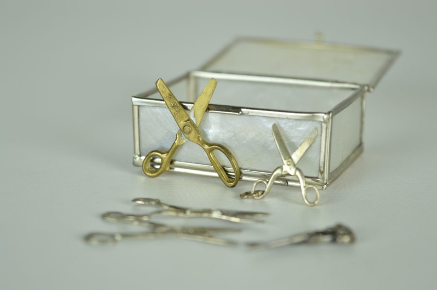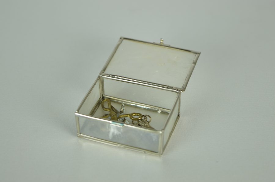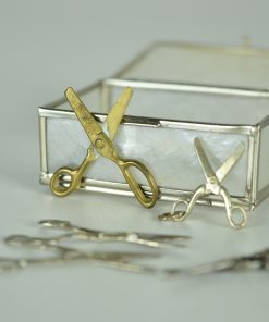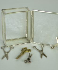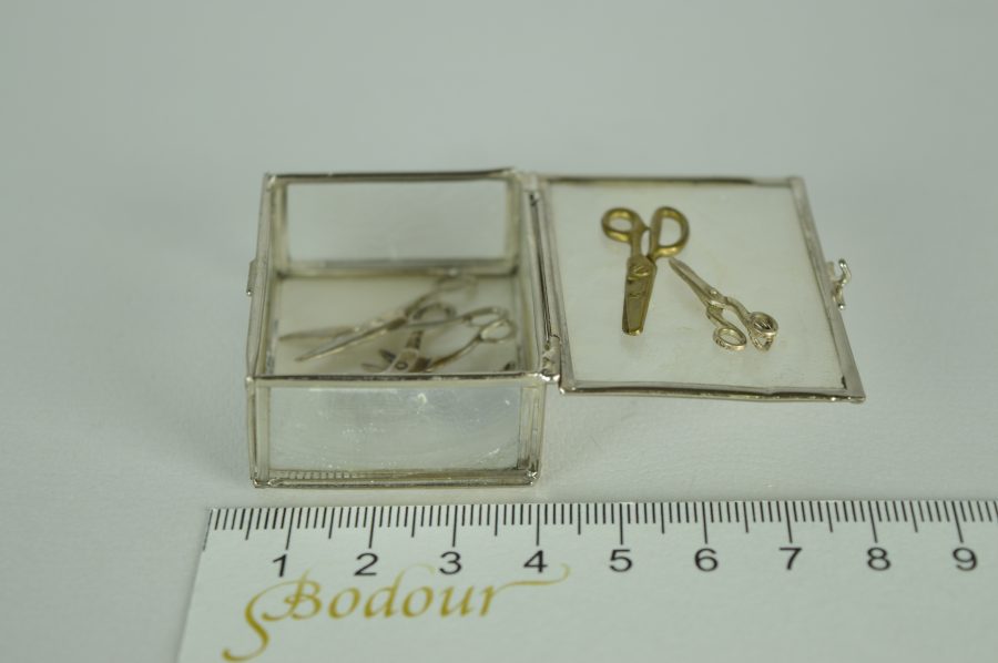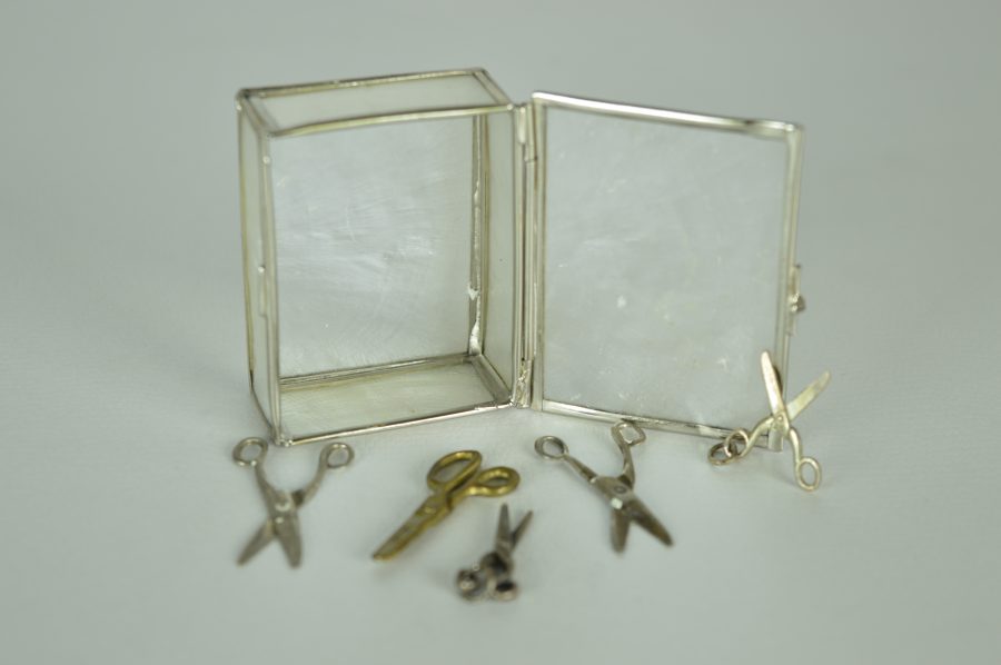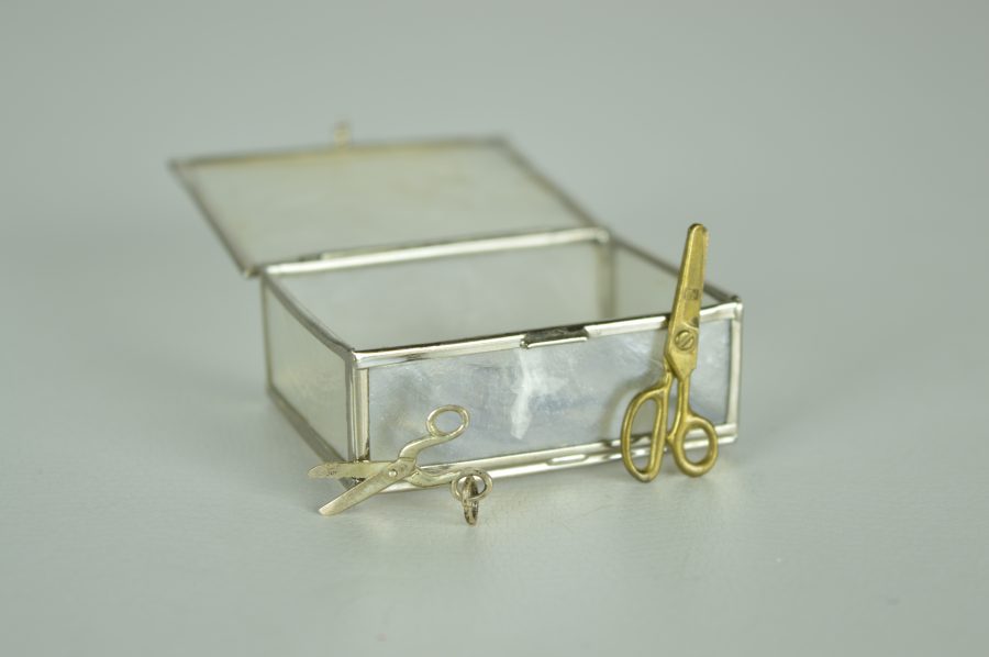 Dit kleine goed afsluitbare doosje is gemaakt van witte doorzichtige schelp en metaal. In het doosje een verzameling van mini schaartjes. Twee van de vijf kunnen echt open en dicht. Leuk als bedel of in een poppenhuis, of om iets symbolisch mee door te knippen.