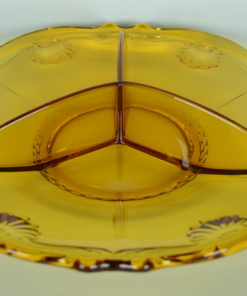 Presenteerschaal van amberkleurig glas met een rand in een schelp- of bloemmotief. De schaal heeft drie vakken om te vullen met drie verschillende zoetigheden, groenten, sausjes of snacks.