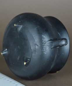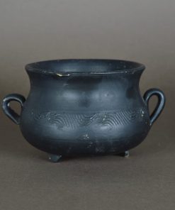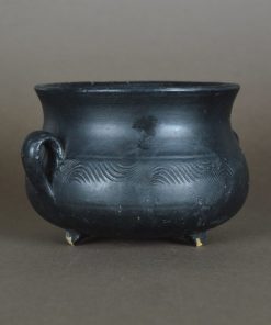 Eenvoudig gestileerde, handgemaakte bijna Japans aandoende delicate aardewerk pot met twee oortjes op drie pootjes. Het zwart geschilderde aardewerk is mat geglazuurd. In de taille een band van ingegraveerde golf patronen Met de hand geschreven Ebeltoft en de cijfers 65 gestempeld, Een Deens ontwerp van Ebeltoft. Gemaakt in de jaren rond 1970.