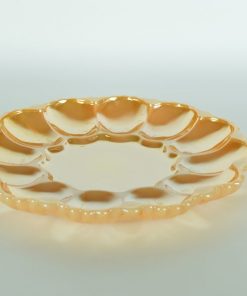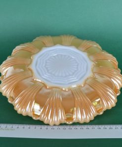 Prachtig glimmend parelmoer-goud-oranjekleurig glazen eierbord van wit melkglas. Speciaal gemaakt voor het presenteren van (al dan niet gevulde) eieren. Plaats voor twaalf hele of halve eieren. Geproduceerd tussen 1950-1970.