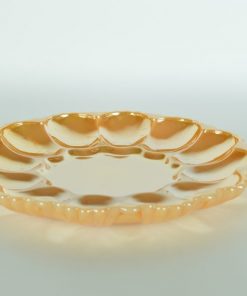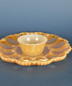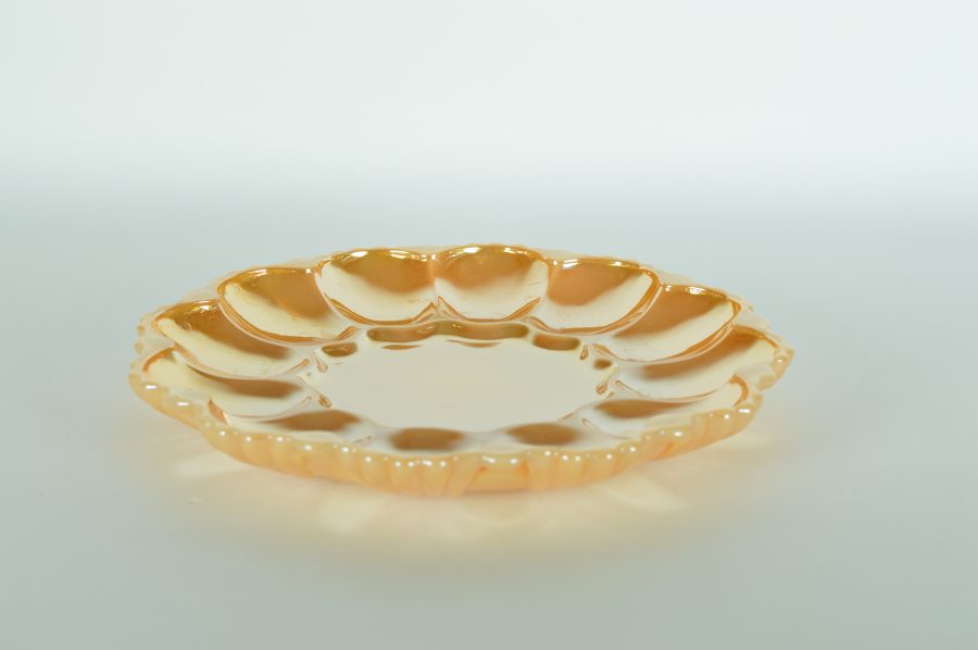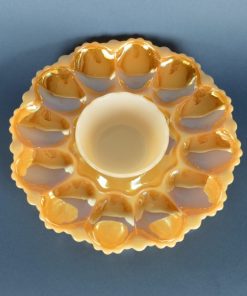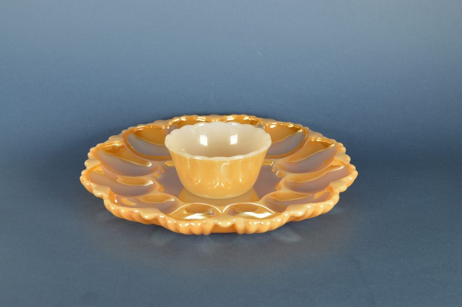 Glimmend parelmoer-goud-oranjekleurig glazen eierbord van wit melkglas. Voor het presenteren van (al dan niet gevulde) eieren. Plaats voor twaalf hele of halve eieren. Vermoedelijk gemaakt in de jaren 1950-1970. De kleine kom is van hetzelfde materiaal en kan gebruikt worden voor sausjes of cocktailprikkers.
