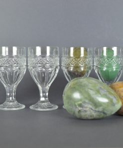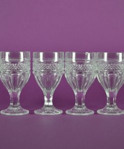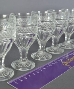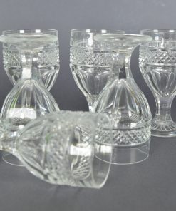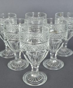 Set van zes stoere eierdopjes van geperst glas, met een band van facetjes om de kelk op een stam met facetten op een bewerkt voetje Feestelijk op een ontbijttafel met geroosterd brood en een glaasje jus d’orange.