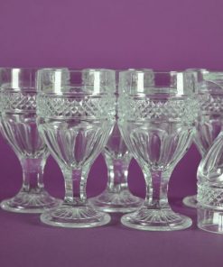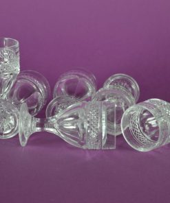 Eierdopjes van geperst glas op een bewerkt voetje en met een band van facetjes om de kelk. Feestelijk op een ontbijttafel met jus d’ orange. Set van zes.