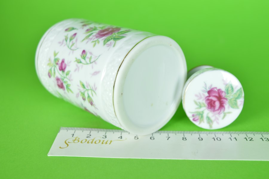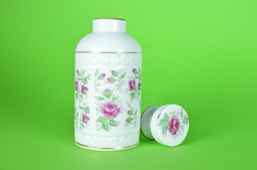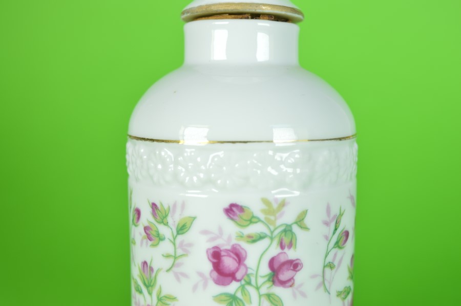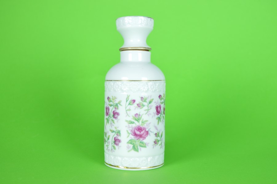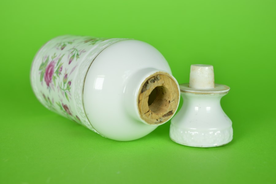 Flacon met bloemen en roze roosjes – porselein en kurk