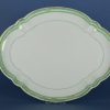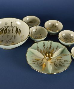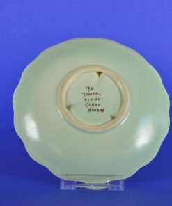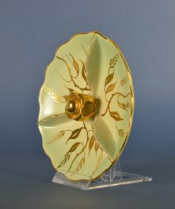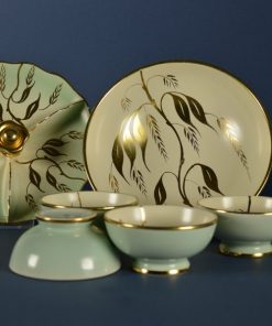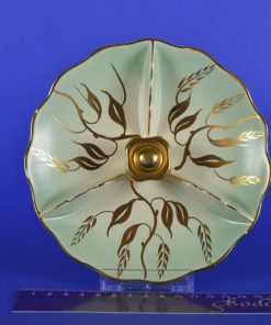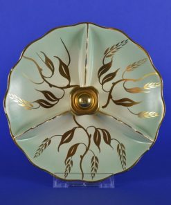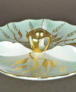 Bonbonschaaltje met drie vakken van Flora Gouda ‘Juweel’, genummerd 170. Prachtig ontwerp met een gouden kroontje in het hart, beschilderd met gouden bloemmotieven en afgewerkt met een gouden bies. Het lindegroen van het schaaltje verloopt subtiel richting kroon naar gebroken wit. Geproduceerd rond 1950.