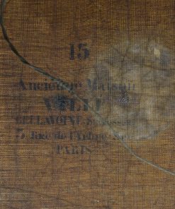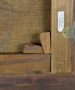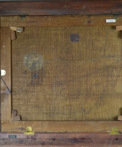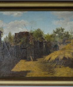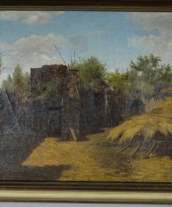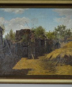 Dit sfeervolle schilderij toont een besloten Frans boerenerf met gemaaid hooi drogend op een rek. De lucht in een prachtig hemelsblauw contrasteert mooi met de geel bruine aarde kleuren van de aardse voorstelling. Geschilderd door een Franse kunstenaar rond 1900 en verhandeld in Duitsland door kunstgaleries, getuige de gestempelde tekst en en sticker aan de achterzijde.