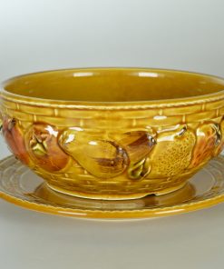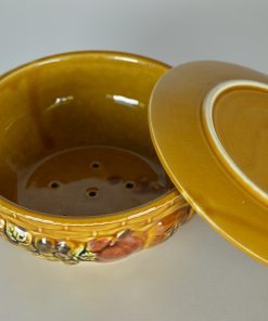 Leuk tijdsbeeld van een solide vintage, fruittest of fruit vergiet, in de vorm van een mandje gedecoreerd met een rand van fruit, druiven, aardbeien, peren, appel en banaan in relief aangebracht. Schotel en schaal zijn eender vormgegeven. De schaal heeft vijf gaatjes en drie inkepingen om vocht af te laten vloeien. Geproduceerd tussen 1960 en 1975.