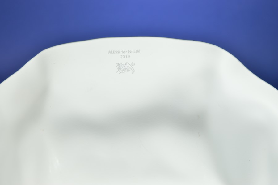 Prachtige schaal voor fruit of andere zaken ontworpen door Lluis Clotet voor Alessi en Nestlé in 2019. In de rand van de schaal een metaalkleurig rondje met de tekst aan de bovenzijde: Alessi, en Italy aan de onderzijde. Eveneens aan de onderzijde een stempel met Alessi for Nestlé 2019 met het logo.
