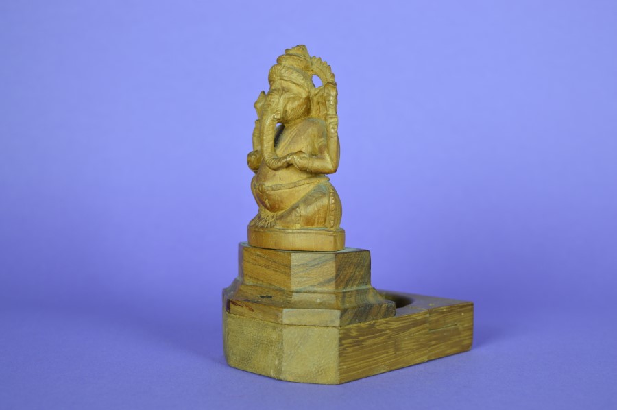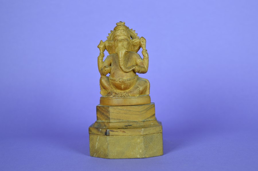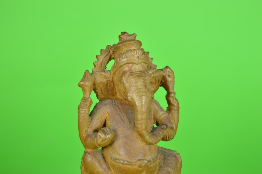 Ganesha is in het pantheon van het hindoeïsme de deva met het olifantenhoofd. Hij is de god van kennis en wijsheid, neemt hindernissen weg en is de beschermheilige van reizigers. Zijn vahana, voertuig, is een muis of een rat genaamd Mashika. De hindoes bidden tot Ganesha voor ze aan iets nieuws beginnen, zoals een nieuwe baan of wanneer ze verhuizen. Ganesha is de zoon van de god Shiva en de godin Parvati, die eigenlijk tezamen in de kosmogonie van het hindoeïsme symbool staan voor de eenheid van alles. Shiva staat voor het subjectieve bewuste en Parvati voor het energetische materiële. Een beeld van hem staat vaak op splitsingen van wegen in India, zodat hij de reizigers kan helpen als ze een keuze moeten maken en een nieuwe weg inslaan. Ganesha staat altijd aan het begin van iets, een eerste impuls. (Bron: Wikipedia)