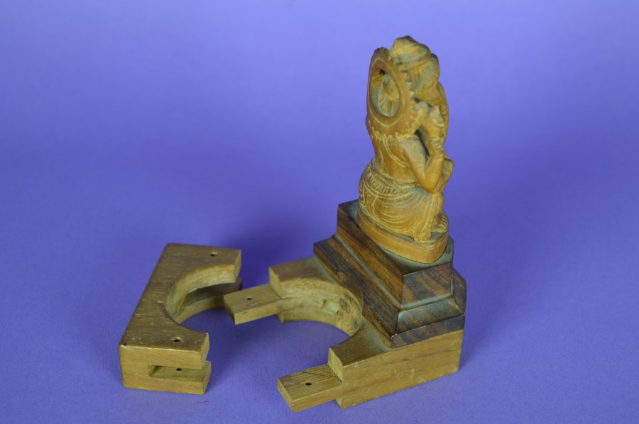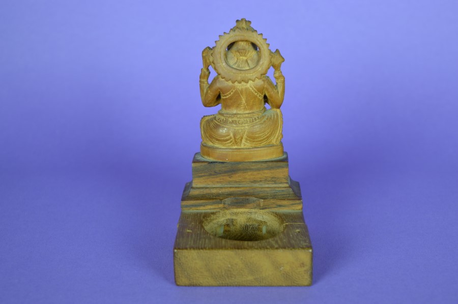 Prachtig fijn gedetailleerd gesneden beeld van Ganesha in massief hout. Deze Ganesha met vier armen heeft een constructie waarmee hij aan een ronde object, boom of paal, kan worden bevestigd. De cirkel heeft een diameter van 4,5 cm. Prachtig op een huisaltaar.