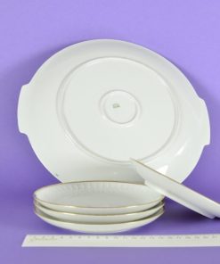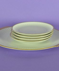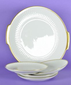 Grote strak vormgegeven Mosa gebakschaal met vier schotels. Gebakschaal en schotels hebben een mooi wafelpatroon relief in het witte porselein. De schotels zijn afgewerkt met een dikke gouden rand. De grote schaal heeft handige grepen aan de zijkant. Geproduceerd tussen 1950 en 1970.