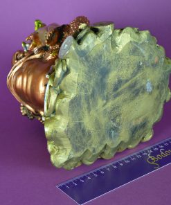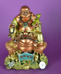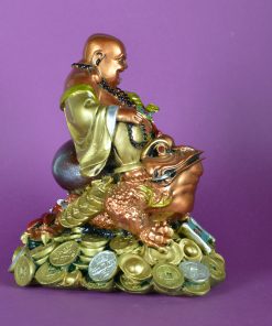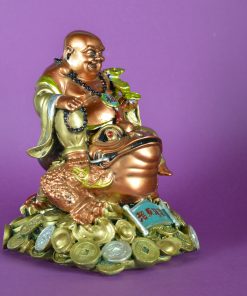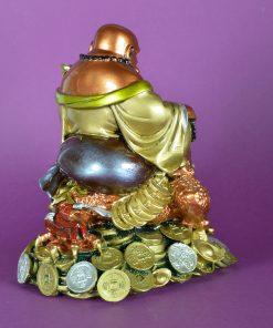Bronskleurige vrolijke boeddha, stevig gezeten op een plunjezak, symbool voor reizen en zoeken, op een feng shui kikker of pad die een hele berg geld zilveren en gouden geld geluksmunten bewaakt. Boeddha houdt in de linkerhand een Rua scepter, symbool voor overvloed, en In de rechterhand een mala gebedssnoer voor welzijn. Om de hals draagt hij een ketting met amulet met Chinese tekst. De kikker heeft fonkelende rode ogen. Superleuk als huwelijksgeschenk.