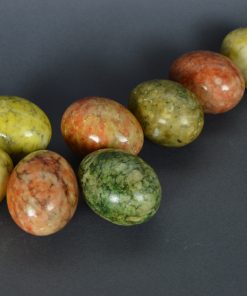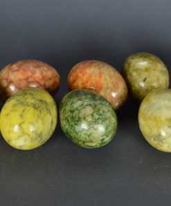 Bijzondere gipsen eieren, kunstig beschilderd alsof het siereieren zijn van echt marmer. In de lentekleuren geel, groen, en oranje. In een bepaalde periode in de geschiedenis werden deze decoratieve sier eieren prachtig nagemaakt als echt marmer te duur was.