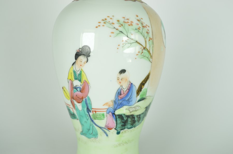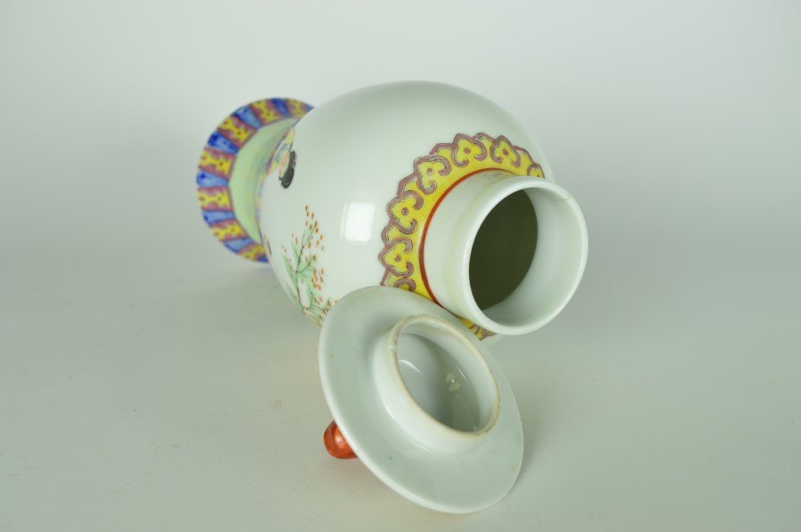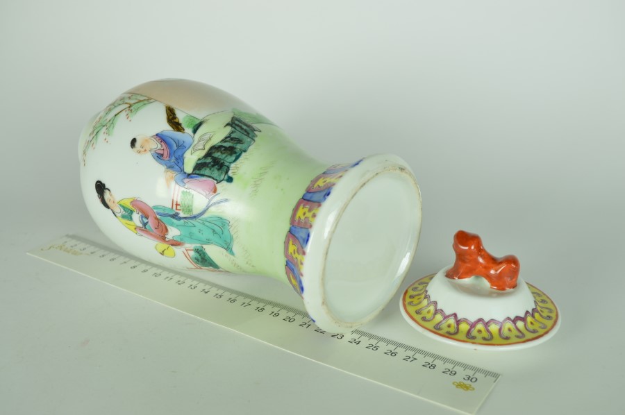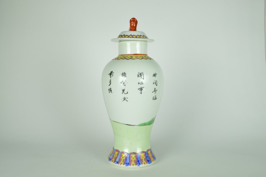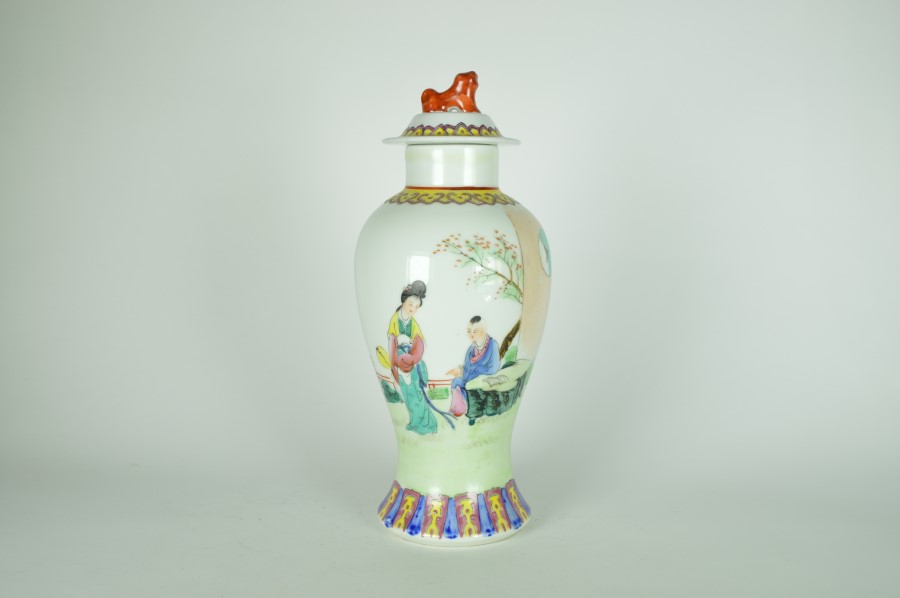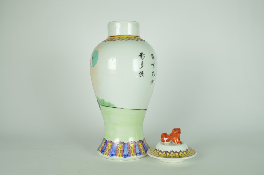 Zonnige balustervormige gemberpot met deksel voorzien van een beschermende ijzerrode leeuw. De met de hand aangebrachte bijna aquarelachtige meerkleurige beschildering toont een man met boek en een vrouw in een landschap met kersenbloesem. Langs de rand van de deksel en de hals een mooie bies. Geproduceerd in China of Japan.