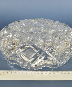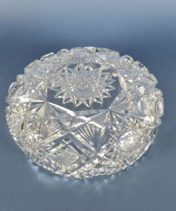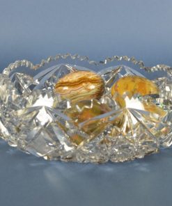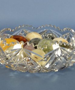 Schitterend fonkelende geslepen kristallen schaal met naar binnen gebogen, gekartelde rand. De aangebrachte versieringen bestaan uit sterren en driehoekige en vierkanten vormen met in het centrum een fijn rasterpatroon. Op de bodem een zestien-puntige centrale ster. Het kristal heeft een zeer hoog loodgehalte. De eieren op de foto zijn verkocht of elders op de site te vinden.