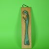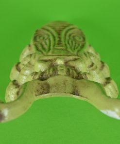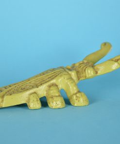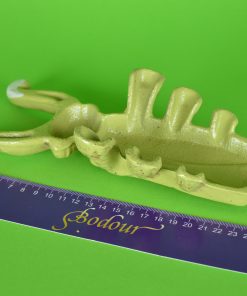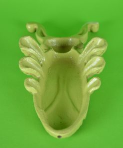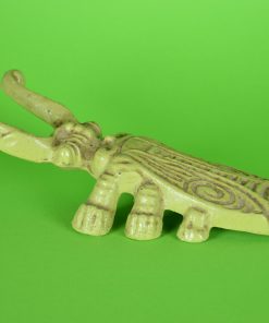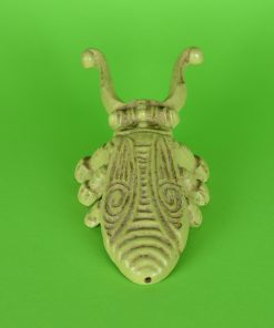 Laarzenknecht uitgevoerd als een gestileerd vormgeven kever met krullen op de dekbladen, uitgevoerd in lindengroen. Een hulpmiddel bij het uitrekken van laarzen. Met één voet staand op de laarzenknecht, de hak van de laars van de andere voet zetten in de laarzen knecht, en de voet moeiteloos uit de laars halen. De decoratieve groene kever is ook een prachtig wandobject.