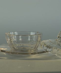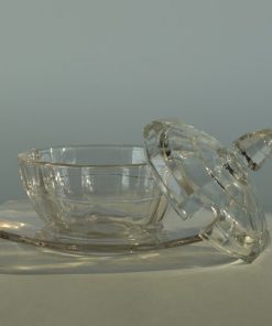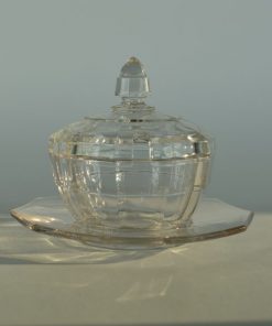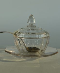 Deze glazen marmelade- of jampot met deksel staat vast op zijn tien-hoekige schotel. Deksel en handgreep zijn ook tienhoekig. De deksel heeft een uitsparing voor een lepeltje. Door het kleurloze glas komt de kleur van jam of hagelslag prachtig uit. Het verzilverde lepeltje is decoratie en niet te koop.