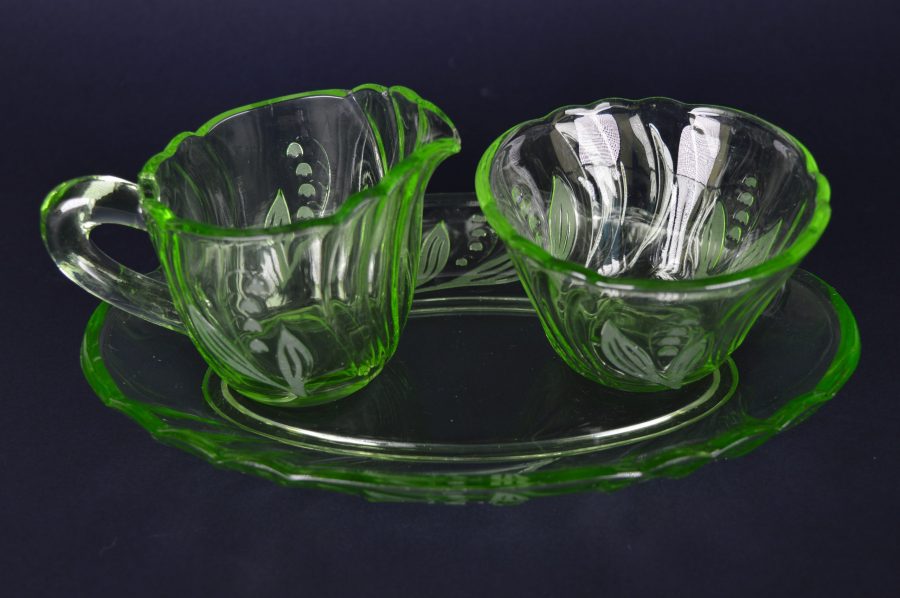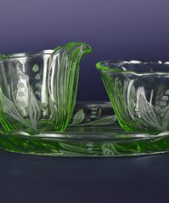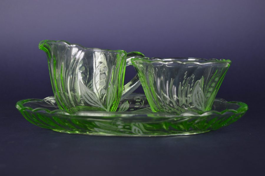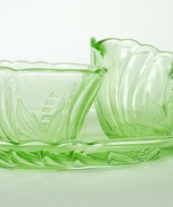VERKOCHT. Suiker en melk stel op een ovale blad met ingeperste zwierige bloemen en blaadjes en geschulpte rand. Geproduceerd rond de jaren dat uranium glas veel gemaakt werd, tot 1940.