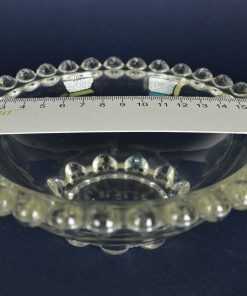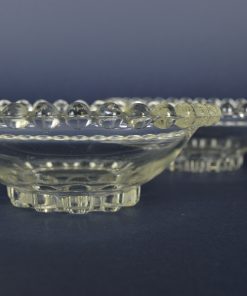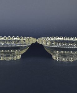 Set van twee antieke stevige glazen schaaltjes met parelrand. Rond de stevige voet is een gestileerde parelrand aangebracht. Geproduceerd tussen 1930 en1950.