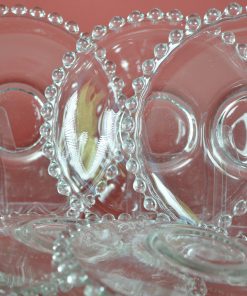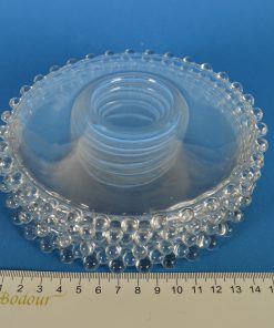 Schoteltje van glas met parelrand van glazen balletjes, zes op voorraad.