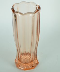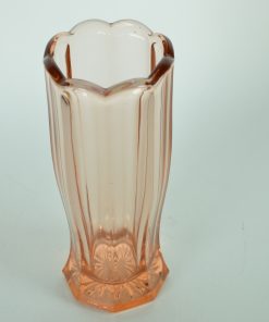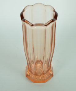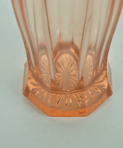 Prachtige roze vaas met geschulpte rand, met onder de licht uitlopende voet een ingeslepen stervorm waardoor de vaas mooie schitteringen vertoont. Geproduceerd rond 1930.