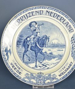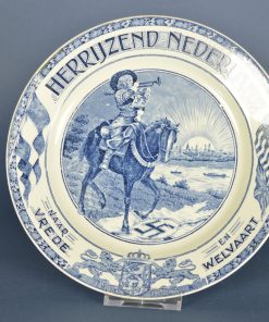 Herdenkingsbord bevrijding van Nederland met de tekst ‘Herrijzend Nederland’, en ‘naar vrede en welvaart’. Een heraut te paard vertrappelt de nazivlag met swastika. Dit wit met blauw gedecoreerde herdenkingsbord is uitgegeven vlak na de tweede wereldoorlog. Het is geproduceerd door Société Ceramique Maastricht. Het bord is opgenomen in de collectie van het Rijksmuseum Amsterdam: www.rijksmuseum.nl/nl/collectie/NG-2003-88