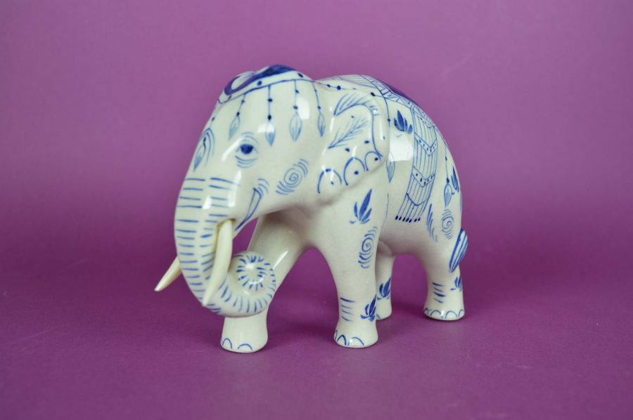 Prachtig gevormde, met de handgedecoreerde olifant. Hij heeft een relaxte houding en tred. Gedecoreerd met kwastjes en bloemen in blauw.