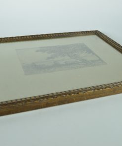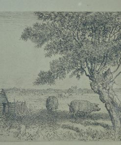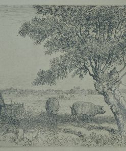 Prachtige, zeer fijne gedetailleerde ets van een tijdloos oer-Hollands rustgevend landschap, een wei met boom en varkens. Op de achtergrond paarden en koeien, een molen en een kerktoren. Vermoedelijk een Brabants landschap. Jan Sühl werkte veel in Brabant. Zijn schilderijen, etsen en gravures hebben vaak als onderwerp landschappen, dieren en boerderijen. De ets is rechtsonder gesigneerd met potlood.