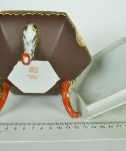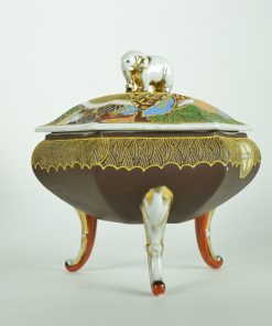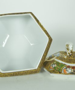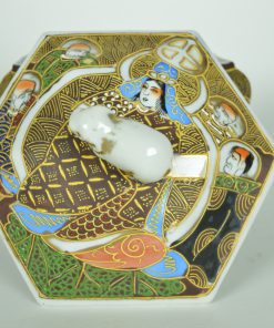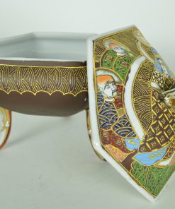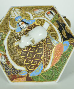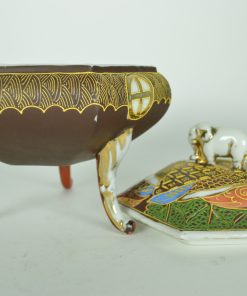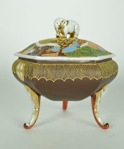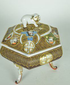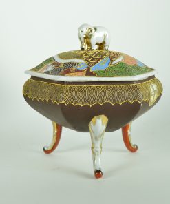 Prachtige antieke, unieke, elegante zeskantige bonbonniere op drie elegante hoge pootjes. Handgeschilderd en fijn gedecoreerd in de Japanse Satsuma stijl. Op de zeskantige deksel staat een olifantje als greep. Gemaakt rond 1910. Aan de onderzijde een stempel met Japanse karakters, en ‘handpainted in Japan’.