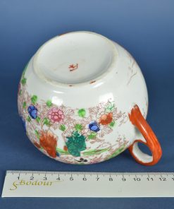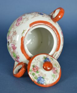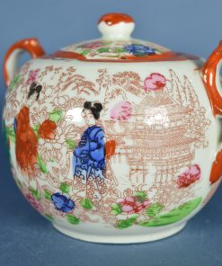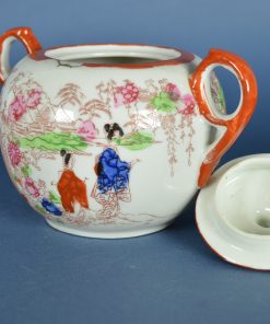 Mooi vormgegeven Japanse suikerpot met bijzondere oren. De decoratie toont drie geisha’s respectievelijk in een rode, blauwe en groene kimono in een landschap met bloemen en authentieke Japanse gebouwen van hout. Het is afgebiesd met een rode rand en wat sleetse goudaccenten. Historische objecten zijn kleine tijdmachines die je ergens mee naar toe nemen. Aan de onderzijde staat een Japans karakter. Vermoedelijk geproduceerd rond 1950.