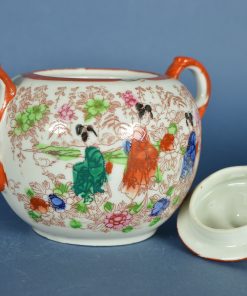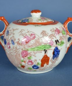 Suikerpot Japans porselein met goudkleurige blaadjes en meerkleurige figuren in landschap