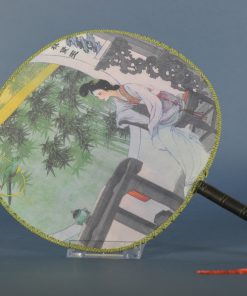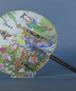 Materiaal: bedrukte, opgespannen stof, afgewerkt met een bies. Het kunststof handvat is 11 cm lang en heeft een rood kwastje