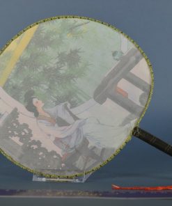 Set van twee Japanse waaiers met verschillende voorstellingen. Een waaier met een voorstelling van twee dames in een bloementuin. De andere waaier met een voorstelling van een dame uitkijkend over een tuin.