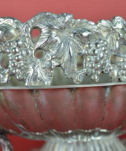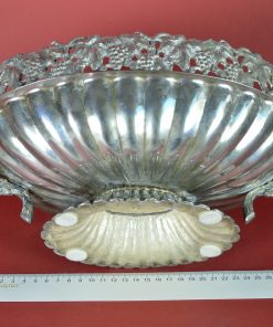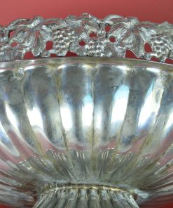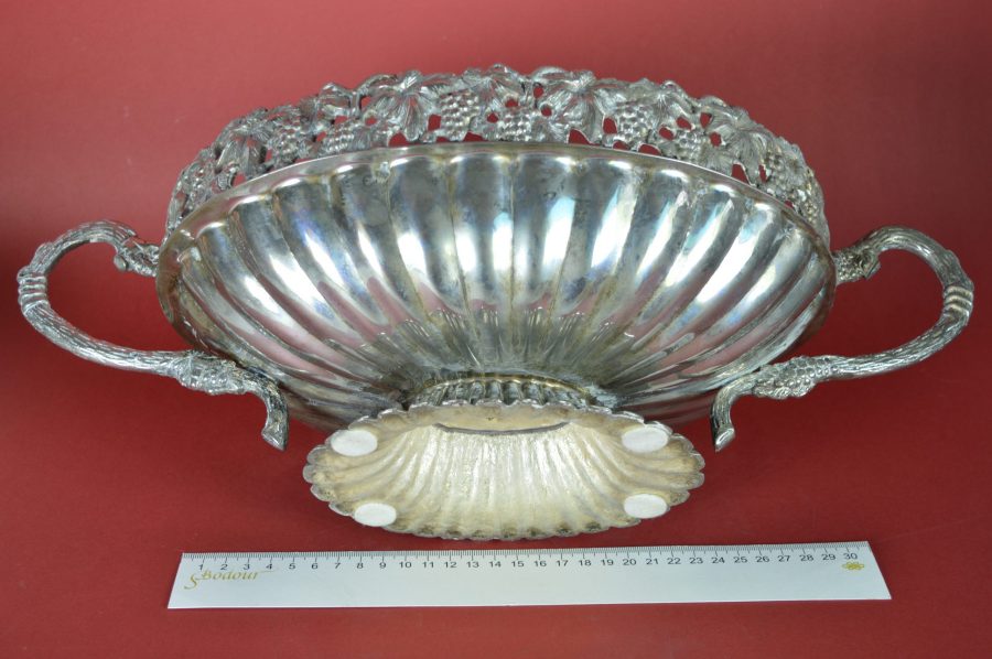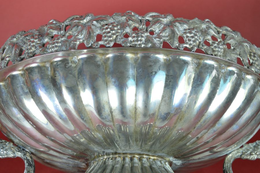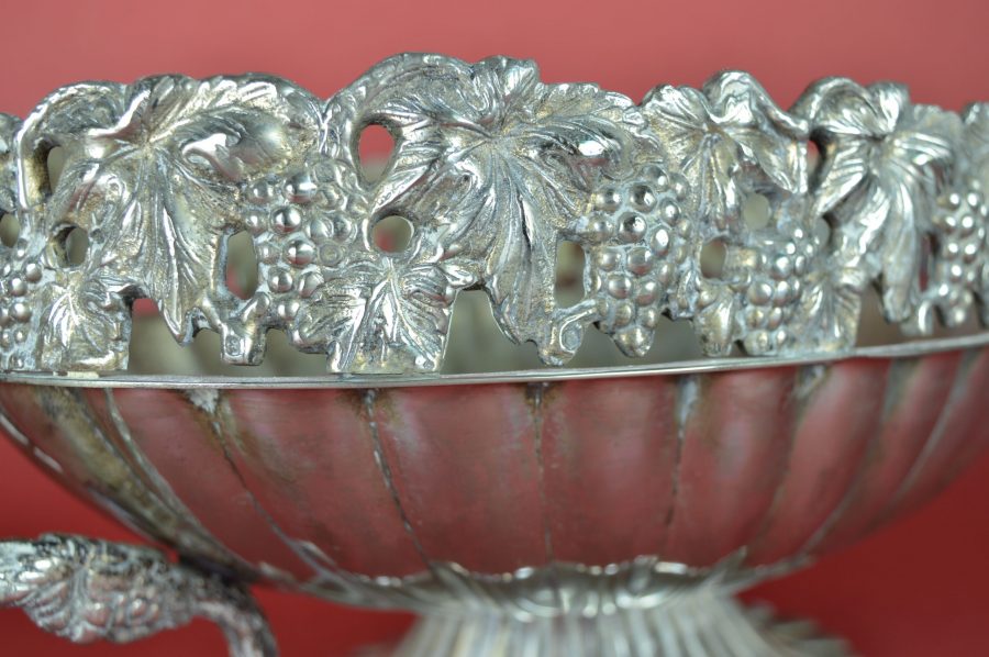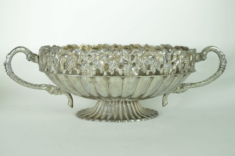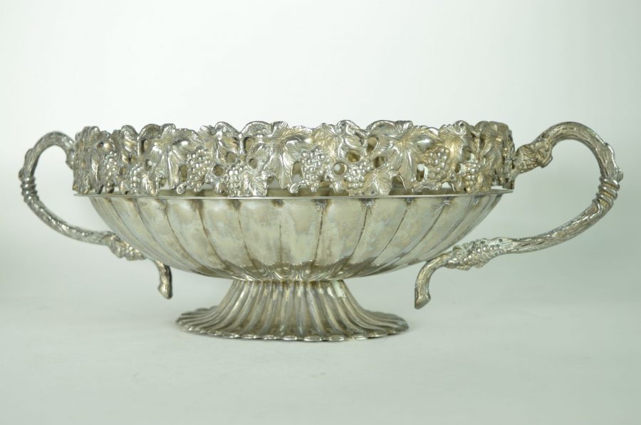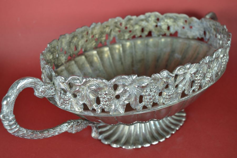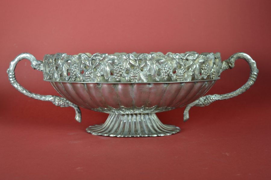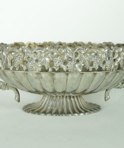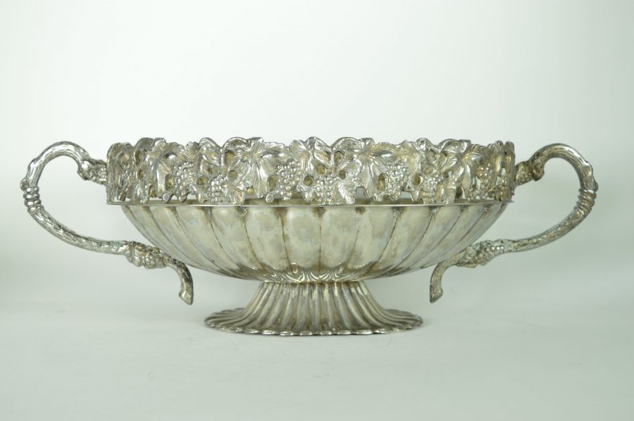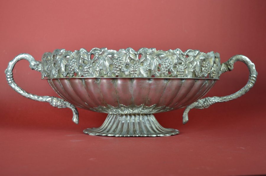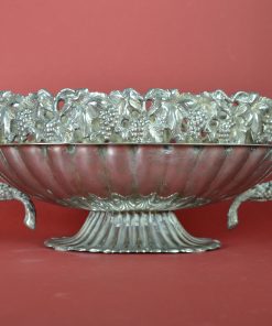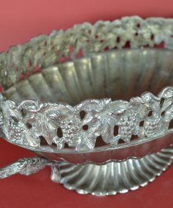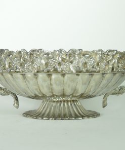 Bijzondere verzilverde bloemenschaal met oren. Prachtig als centerpiece met bloemen of fruit op een rijk gedekte eettafel, op een sidetable, of een prominente plek in de hal of woonkamer. Deze jardinière is gedecoreerd met een guirlande van druiventrossen en druivenbladeren, met druivenranken als handvat.