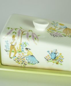 Zonnig zomers, vrolijk tijdsbeeld uit de jaren rond 1950 in de vorm van een kaasstolp of botervloot. Het toont een tuinierende man met pijp en tuinierende vrouwen tussen bloeiende bloemen en een roze seringen of bloesemboom. De onderschaal in de zo typerende appelgroene kleur heeft de letters Beswick England 1781 op de achterzijde. In de stolp de gouden letters Green fingers” en het merk Beswick Engeland.