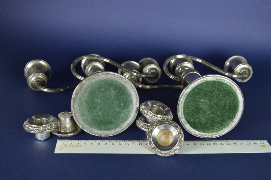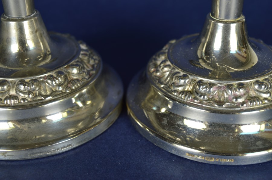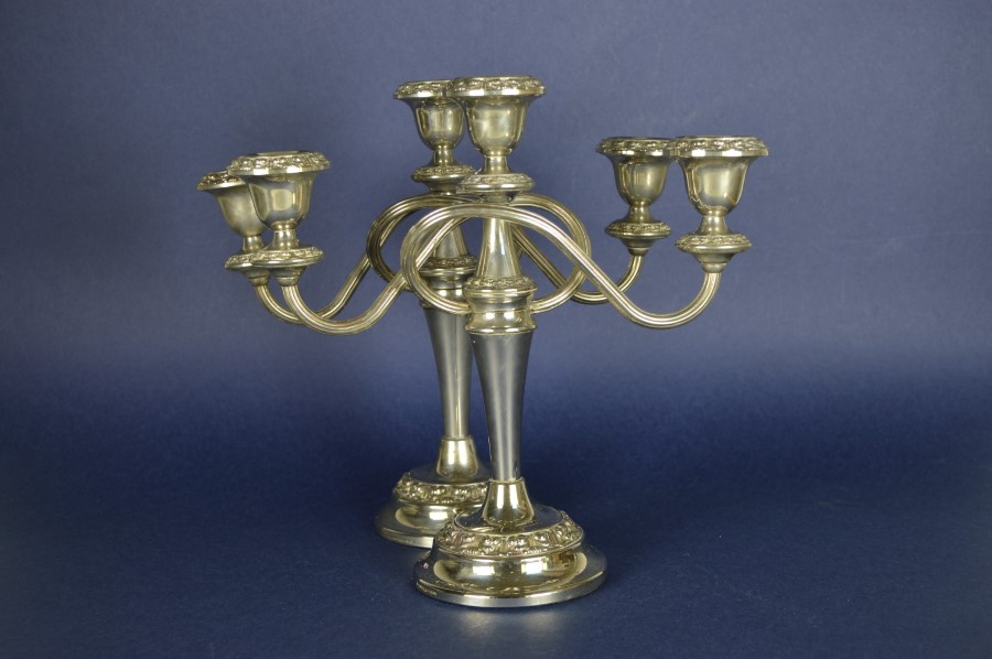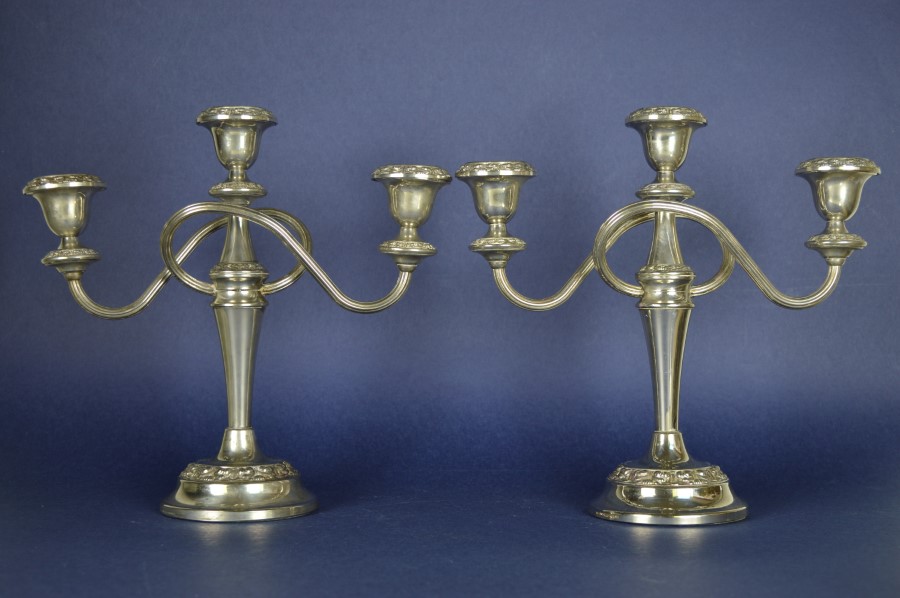 Twee prachtige identieke driearmige kandelaars met zwierige armen en gedecoreerd met biezen met op rozen lijkende fantasiepatronen. Elke kandelaar heeft 3 afneembare bobeches. Op de onderzijde van de middelste arm de tekst: PAT NOS 1229 1958. Op de voet de tekst: Silver Plated Lanthe of England.