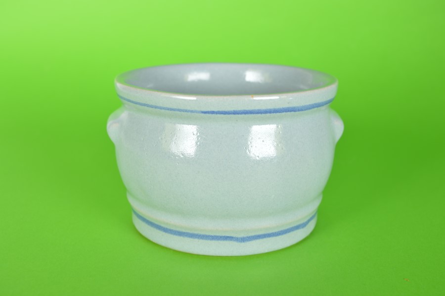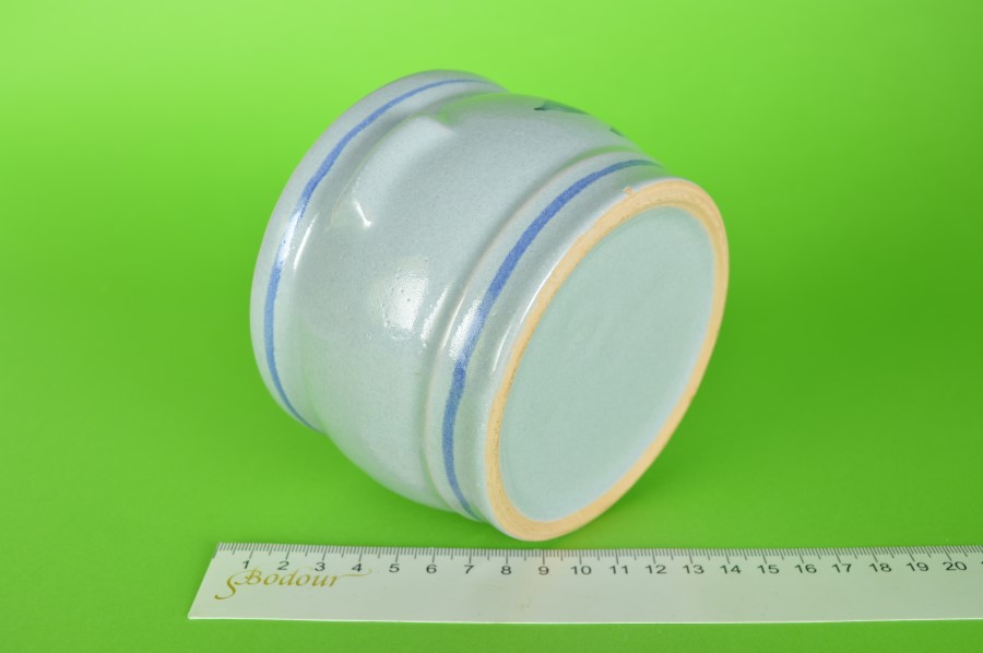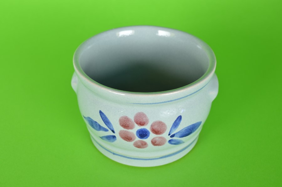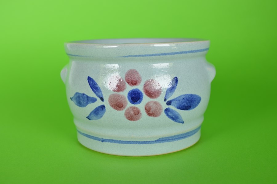 Keulse pot met rode bloem met blauwe blaadjes. Aan de onderzijde in reliëf de tekst:  603 – 13 G. Handig om bloemen in de kweken of om kruiden of zout in te bewaren.