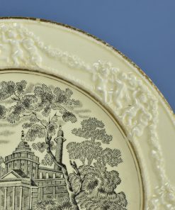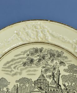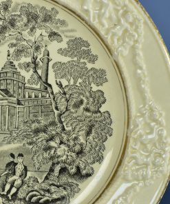 Bijzonder, antiek klein bord met een zwarte decoratie op gebroken witte ondergrond. In de brede rand een voorstelling in relief van zeven keer vier engeltjes die een guirlande van bloemen dragen. In het centrum een romantisch middeleeuws tafereel met op de achtergrond neoclassicistisch kasteel en op de voorgrond recreërende mensen in een landschap. Afgebiesd met een gouden biesje. Op de achterzijde in een bloemencartouche de inscriptie: Italian Scenery zwart – W. Adams & Sons England. Geproduceerd rond 1850.