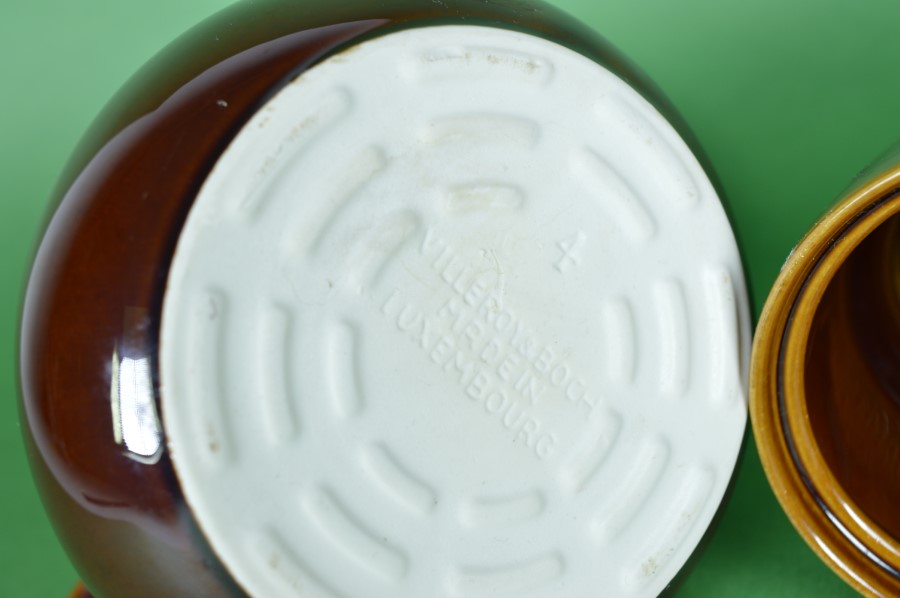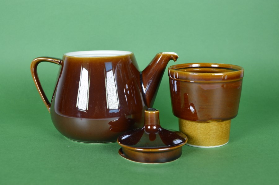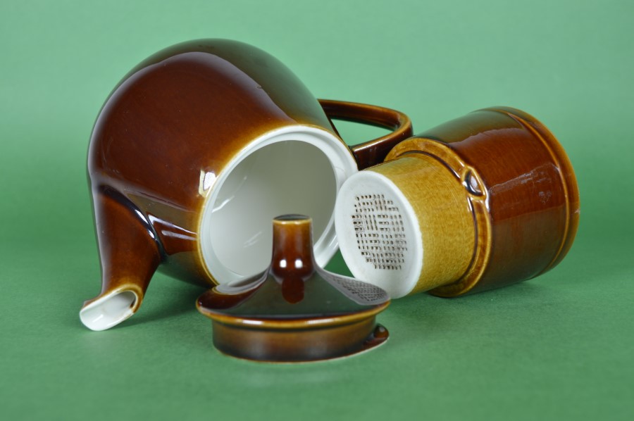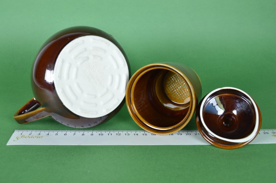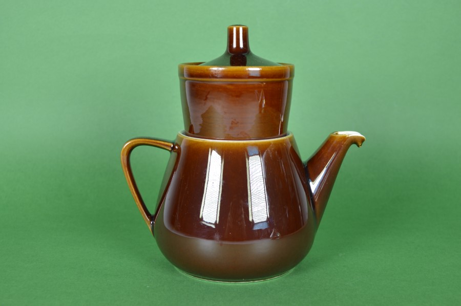 Mooi vormgegeven glanzende koffiebruine klassieke koffiepot met filter. Aan de tuit een anti-druppelaar. De deksel past op filter en pot. Inhoud is ongeveer een halve liter. Aan de onderzijde de tekst: Villeroy & Boch made in Luxembourg. Geproduceerd rond 1970.