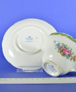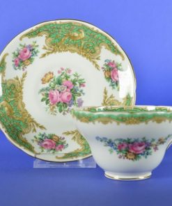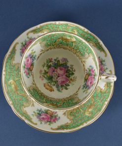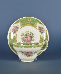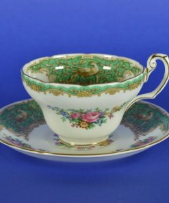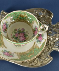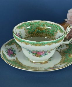 Prachtige delicate theekop en schotel van ‘Coalport in de lijn Montrose Green’, gedecoreerd met een motief van bloemen. De vogels, vermoedelijk pauwen, vormen het centrale motief in het groen met gouden cartouche. De randen en het oor zijn omrand met een gouden biesje. Kop en schotel zijn gemaakt in Engeland.