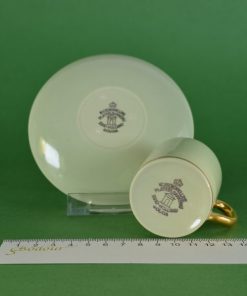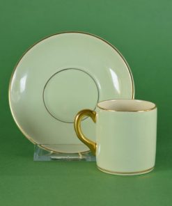 Eenvoudig, elegant, strak vormgegeven glanzend klein kopje met schotel voor mokka of espresso, Uitgevoerd in zacht groen met een crèmekleurige binnenkant, afgewerkt met een gouden bies. Geproduceerd door Gouda Holland koninklijke plateelbakkerij. De diameter van het kopje is 5 cm.