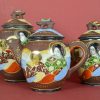 Kop en schotel met bamboe | Chinees eierschaalporselein met Geisha, set van vier